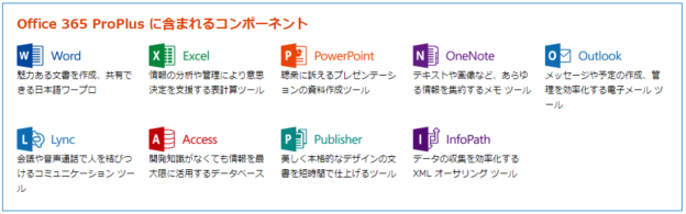 ローカルでもクラウドでも作業が出来るようになったオフィス「Office 365 ProPlus」に、メールサーバーと従来のアウトルックにもあったスケジュール管理をクラウド化した「Exchange Online」、ファイルサーバー、状況共有サイトの作成機能のある「SharePoint Online」、