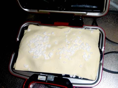 今回の経験則から、ワッフルシュガーは一番最初に下側プレートの上にばら撒くことを推奨します。