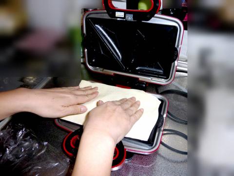 ベーカーにホットサンドプレートをセットし、電源入れて程好く温まったら、下側プレートの上にパイシートを敷きます。