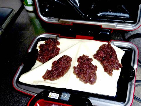 正味な話、あんこも市販品使うなら、ワッフルシュガー散らして、パイシート置いて、あんこ置いて、パイシート置いて焼くだけで、話題の クロワッサンたい焼き と同じような物が簡単に作れます。