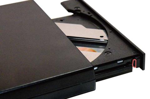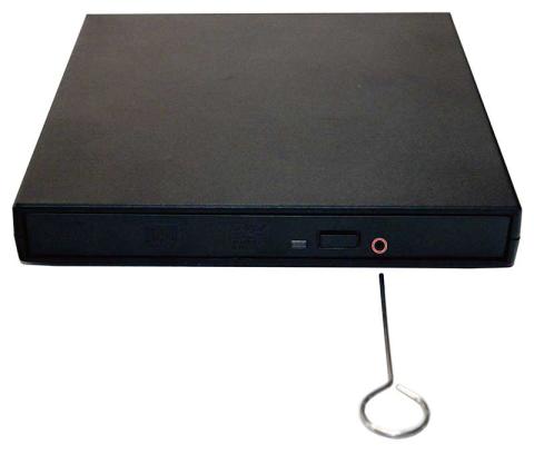 最初に、光学ドライブの強制EJECT用穴にイジェクト用ピン(無ければ細い精密ドライバーやクリップピンを伸ばした針金でもOK)を挿してEJECTします。