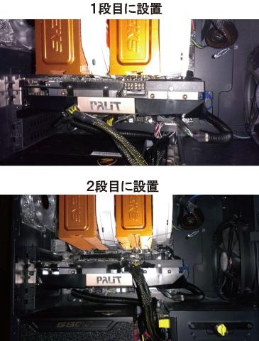 一段目に置けなくも無いのですが、ファンクリップがビデオカードの基盤に当たりそうで当たっていない状態です。