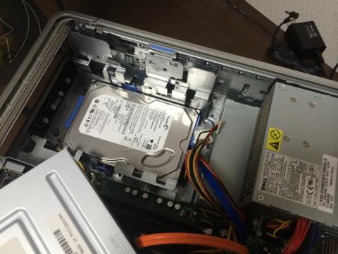 HDDの入れ替えはそんなに難しくなく。とりあえずテスト用ということで箱は開けっ放しで作業します。DELLのケースの分解はとても楽です。青いレバーを押したりするだけで簡単に部品を取り外せます。ケースともにネジを使わなくても分解ができるのでとても便利です。