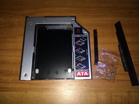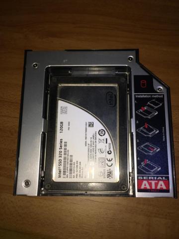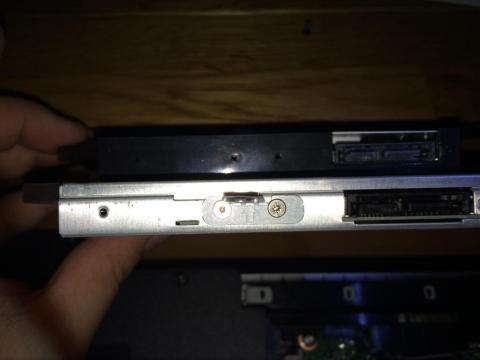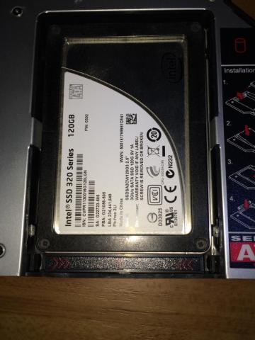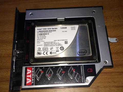 起動ドライブ側にSSD,このアダプタにHDDを取り付けて無事換装が終了しました。
