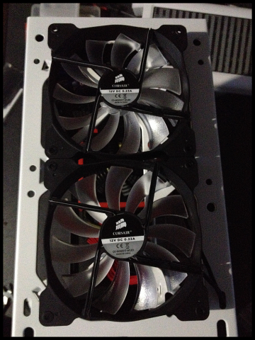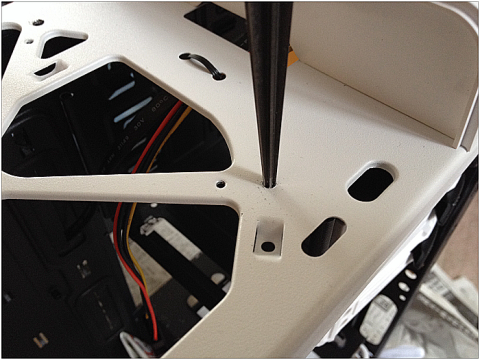 ①ファン設置用のネジ穴がM3使用なので、CORSAIR AF120(AF140)を設置するためにリー マーでネジ穴を拡張しました。前面は非常に苦労しました…