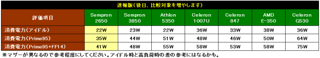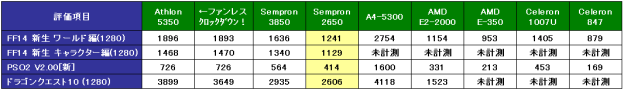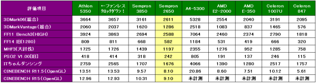 Sempron2650/3850とAthlon5350以外の結果は以前の私のレビューの使いまわしです。