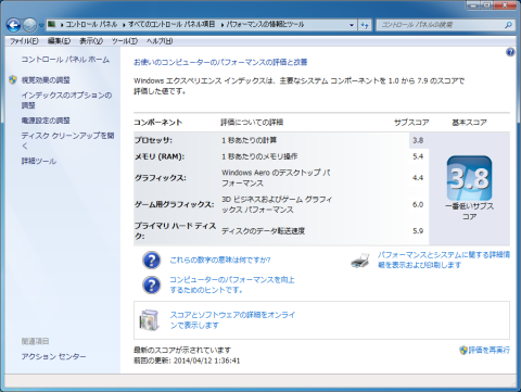1.Windowsエクスペリエンスインデックス(Windows7 64bit)