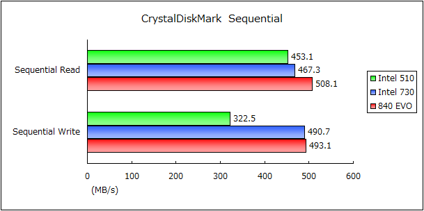 下位モデルとなるIntel SSD 530(以下SSD 530)の480GBモデルでは、シーケンシャルリードが540MB/s、ライトが490MB/sであることから、シーケンシャルアクセス性能においては、優位性は見られない。