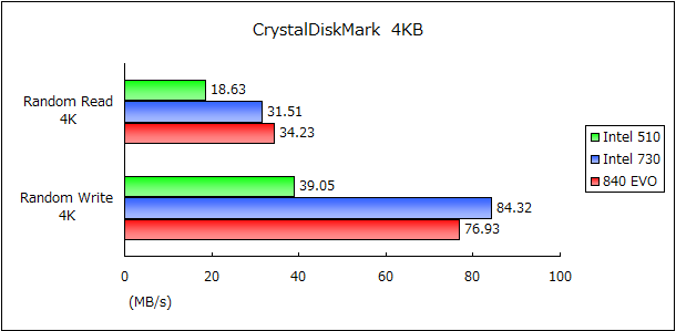 ランダムリードにおいては、シーケンシャルリードと同様にSSD 730は840 EVOに及ばない。