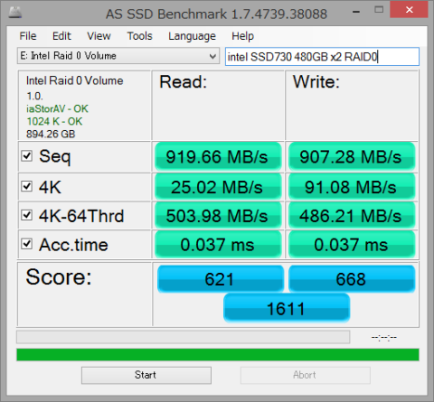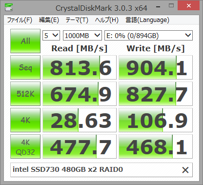 RAID0環境では、キチッと倍ちかく値が伸び、それぞれRead:920MB/s、Write:907MB/sと、1GB/sまであと一歩のところまで数値を伸ばしています。