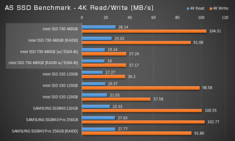 好敵手ともいえるSAMSUNG SSD840 Proですが、ここでは単体ドライブではintel SSD730をわずかに上回るスコアを叩き出しています。