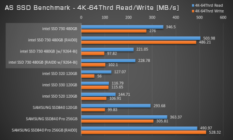 4K 64スレッドテストにおいてもSSD730の優秀さは抜きんでており、Read:347MB/s、Write:276MB/sとずば抜けた数値を叩き出しています。