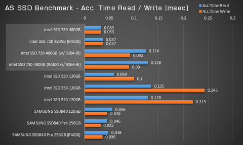 HDDと比べると圧倒的に高速なSSDのアクセスタイムですが、最新のSSDでは0.1msを大きく割り込んでおり、SSD730ではRead/Write共に0.033msまで高速化されています。