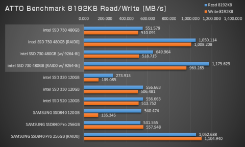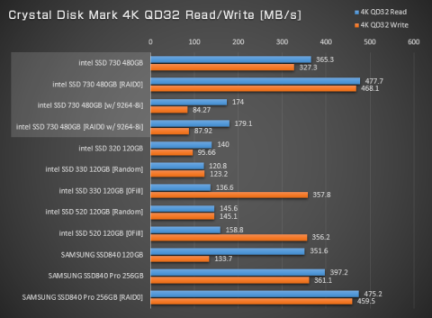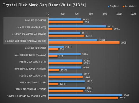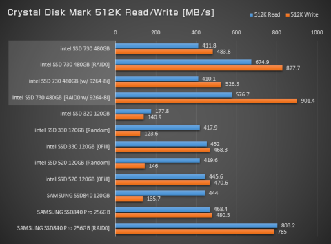 今回は2台でのレビューとなりますので、SSD730単体のほか、2台でのRAID0構成と、もとがエンタープライズ向けのSSDということもあり、MegaRAID SAS 9264-8iでのベンチマーク結果も測定しています。
