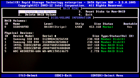 SAMSUNGのSSD840 Proですが、なぜかRAID0構築時のスコアが528MB/sとなってしまっています。