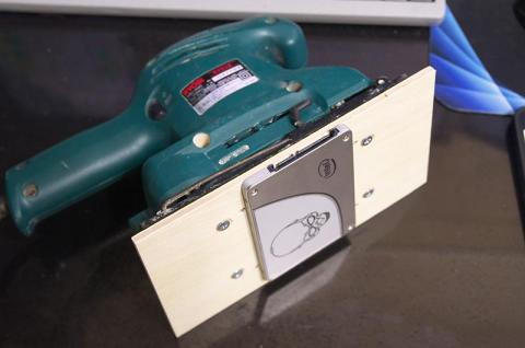 サンダーの振動プレートを本体に取り付けるネジ穴を利用し、SSDを取り付けた木板ごとサンダーに固定します。