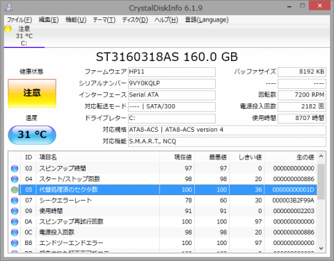 実験を終了した状態でCrystal Disk Infoを確認してみると…見事にエラーが無いことを確認しました。
