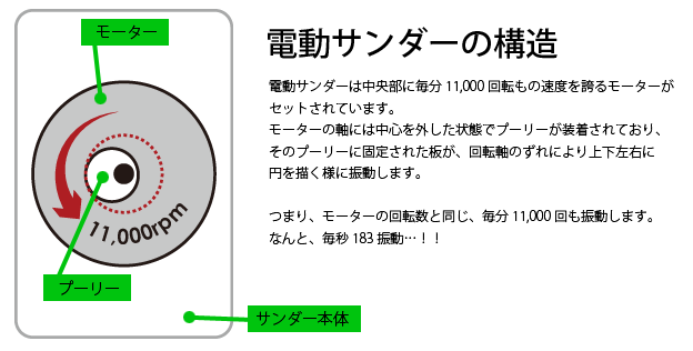 この電動サンダーですが、どういう仕組みになっているかというと、中にモーターが組み込まれており、中心から少しずれた位置にプーリーが固定されていて、モーターがプーリーを回すことで振動が発生し、ヤスリを超高速で動かすことで、お手軽に研磨することが可能です。