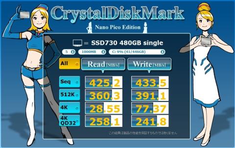 実際の速度をCrystalDiskMark Nano Pico Editionでシングル時、RAID0時をそれぞれ計測してみます。