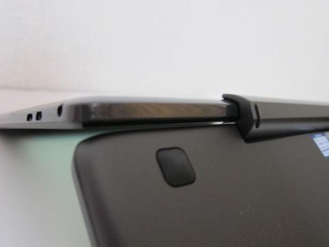 ドッキング構造は,専用のコネクタに差し込み,フックでロックされる仕組みです.キーボードドック部中央にロック解除用のボタンがあり,このボタンを押すことでロックが解除され,簡単に分割できます.しっかり固定されるので,タブレット側を持ち上げても,キーボード側を持ち上げても,そのままの角度で,普通に扱えます.一般的なノードPCと全く同じと考えて大丈夫です.なお,操作は,電源ONの状態でも可能で,Plug&Play方式でキーボードとUSB3.0が認識され,すぐに使えます(USB3.0方式のメリット).