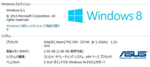 CPUは,Bay TrailといわれるIntel Atom Z3740(4コア/4スレッド、クロック 1.33GHz/1.86GHz)で,メモリはオンボードで2GB(増設不可),ストレージは64GBのeMMCとなります.ネットワークは,a/b/g/nとBT4.0で,インターフェースは,microHDMI,microUSB,microSD,マイク/ヘッドフォンコンボジャック,USB3.0(キーボードドック側)になります.