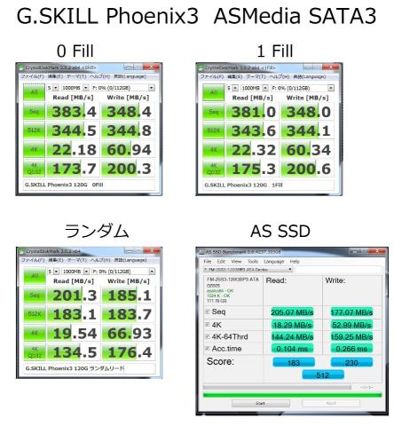 CrystalDiskMarkでは、380MB前後の速度が頭打ちになるASMediaコントローラーより、Intelコントローラーのが当然速度がでているのですが、AS SSD BenchmarkではなぜかASMediaコントローラーの方が良いスコアーが出ています。