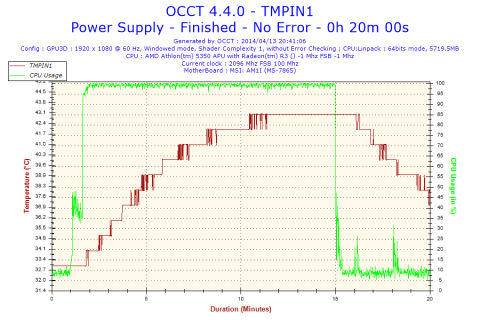 純正クーラーだけの構成でテストした結果だが、Athlon5350はOCCTの最大負荷状態でも45℃に到達しないという優れた結果を示した。