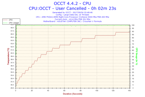 なんとFX-8350のOCCT30分だと48度に届かない(室温は28度程)。実はこれ50度からファン回転数が上がる設定なのでアイドル時どころかOCCT中ずっと900rpm。音に変化がなく本当にOCCTが動いているのか心配になったレベルだ。仮組状態でバラックに近い環境での計測なのでエアフローがしっかりしたケースならもっと冷却力は上がるし窒息ケースでも耐える能力を持つ。