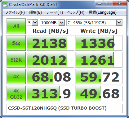 またパッケージ表記の公称値にも差がでている。まあ海外パッケージ版はそのSSDに適したベンチを使って少し大げさな数値を出していた感もある(Read554MB/s Write512MB/s)のだが、CFD版は代理店で計測した数値になっているようで謙虚な値(Read514.3MB/s Write475.9MB/s)になっている。