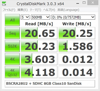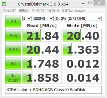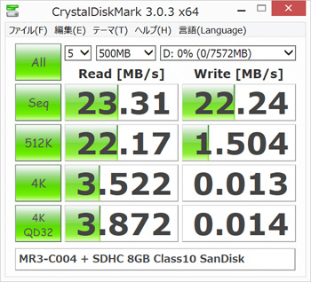 本製品はUSB 3.0に対応しているので、メディア次第ではハイスピードを体感する事ができると思いますが、今現在私が所有しているSDメモリカードで速そうなのは30MB/sの「Extreme 8GB」くらいです。