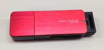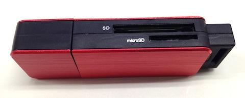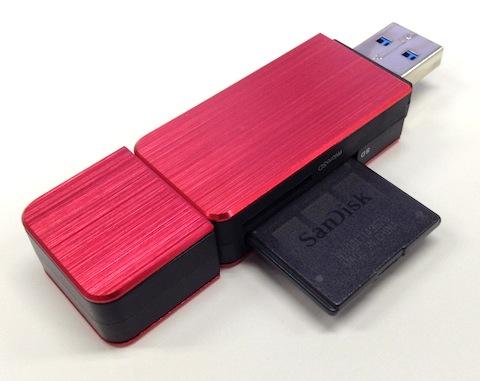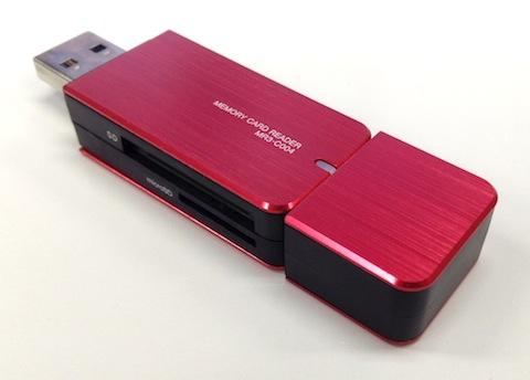 パッと見はまさにUSBメモリーそのもので、スロット面を見てようやくカードリーダーなのだと気が付く感じです。実際にUSBメモリーと並べてみても、全く違和感がありません。