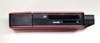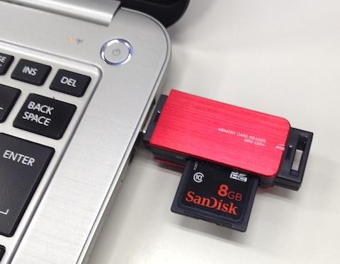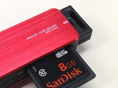 SDメモリカードは、薄めなので、さしっぱなしで使うのはちょっと怖い気がする形状ですね。でもカードリーダは、下手に取り出せなくて苦労しなくてすむように、はみ出て装着できるものが最近は多いかもしれません。