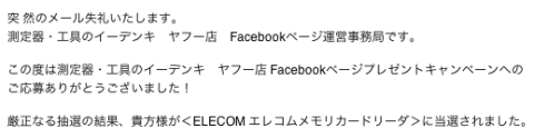 イーデンキの「Facebookページプレゼントキャンペーン」に応募したところ、運良く当選して頂いたメモリカードリーダーです。Twitterからの応募(Crocos)で初めて当たった記念すべき一品です。