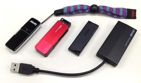 一般的なUSBメモリーに近いコンパクトなサイズ、一番右はB社製カードリーダー