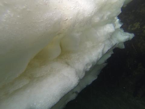 特殊なウェットスーツを着ると、こんな海でも浮いていられちゃいます。(さすがに潜れはしなかったけど)ちょっとその時の写真がいい感じに撮れなかったのが悔しいところなんだが、海の中から氷を撮った写真。