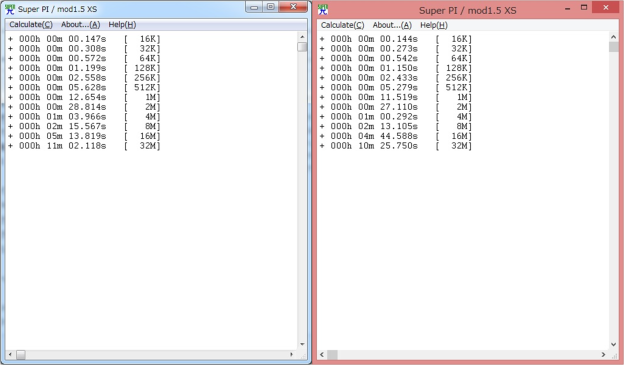 SuperPiのベンチでIvy Bridgeの3.2GHzとHaswellの3.0GHzの比較ですが、シングルチャンネルメモリのHaswellが勝っているところを見ると、メモリ帯域はボトルネックになっていないような気もしますね。私もQSVのベンチをやっている時にメモリ速度が効くのを見たことがありますが、それ以外では余程データI/Oがインテンシブなタスクじゃないとメモリの差は出にくいんじゃないかという印象を持っています。HiroさんのRamDiskのベンチで、1333のデュアルチャンネルと1600のシングルチャンネルで拮抗しているデータ(シーケンシャルとランダムで逆転)は面白いです。ランダムアクセスはチャンネルを割り振るところで多少オーバーヘッドが出るということでしょうか。メーカーとしてはシングルチャンネルで良しという判断だったんでしょうね。ベンチマークご苦労様でした。