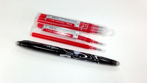 ボールペン本体の尻に付いているゴムで擦ると紙に書いた文字の色が消える。