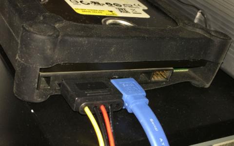 電源は、ACアダプタの4ピンの5V/12V出力をSATA電源15ピンへ変換するケーブルを経由して使用ました。HDDはシリコンのパンツを履いていますが、古くて埃っぽいです。