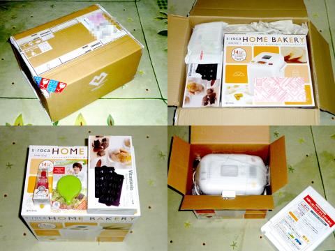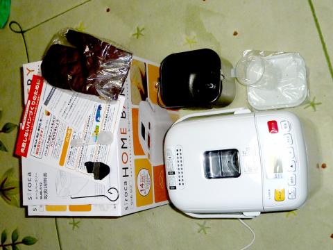 本体にパンケース、パン羽根(パンこねる部品)、ジャムふた(ジャム作るときに使う蓋)、計量カップ、イースト用計量スプーン、ミトン、羽根取り棒(羽がパンに埋まった時に取り出す奴)、説明書、ですね。