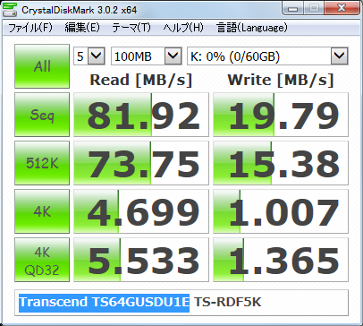 Transcend TS64GUSDU1EをDZ68DB(PC)のUSB3.0ポートに接続して速度を計測しました。