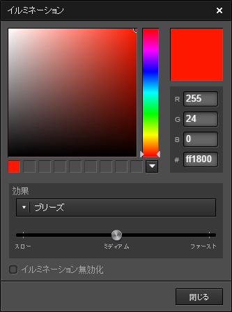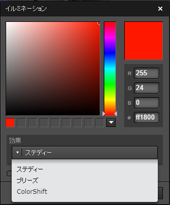 ステディー(常時同じ色で点灯)、ブリーズ(間欠点灯)、ColorShift(色が変化)、無しが選べます。