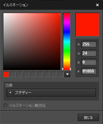 常時同じ色で点灯します。色の明るさも暗くすることもできます。