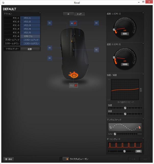 ボタン6で切り替える2段階の感度、加速/減速、アングルスナップ、ポーリングレート と