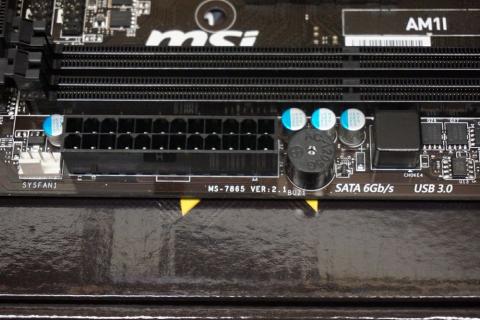 今回購入の決め手となったMini-PCIe。真横にはSATAコネクタがふたつ。ん~、使いづらそう。その下のPCI Expressは×16スロットでGen2.0仕様ですが、Kabiniの仕様で×4でしか動作しません。そう考えると邪魔なスロットに見えてきます。