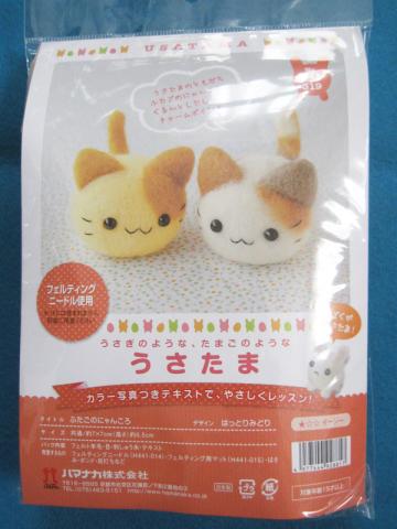 残りの1/2をほぐしてかぶせてチクチク羊毛残り1/4で尻尾作成フェルケット2色で耳を作成耳・尻尾・模様をチクチクっとくっつけ目・口・ひげをつけたら完成ねこ…か…?なんか見本と違うよ!