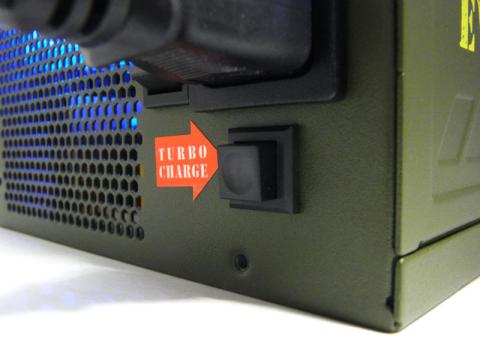 更に背面には「TURBO CHARGE」なる押しボタンが。なんとこのボタンを押すとモードが切り替わりただでさえ大きい850Wの出力が+100Wの950Wまで耐えられるようになるというロマンあふれるギミック。