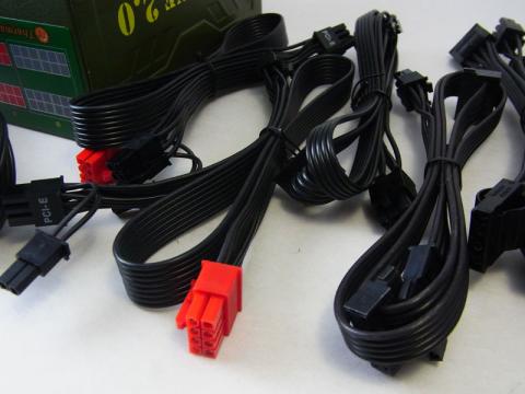 ケーブルはブラックに統一され、ケース内はすっきりまとまるが取り回しは少々硬い。コネクタ数は出力に合わせて多くVGAの多数運用もOK。使用頻度の少なくなった小4pinも同デザインの変換ケーブルを添付することで対応。