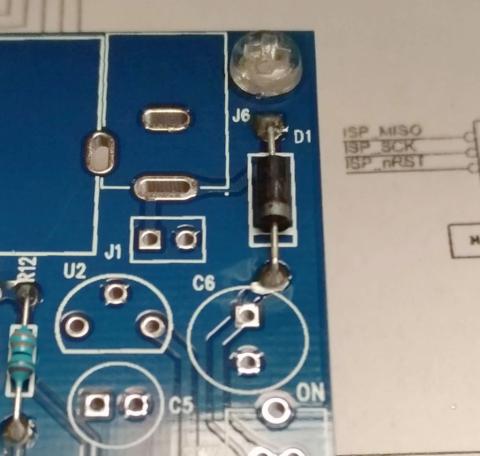 続いてダイオード。こちら向きがあるので基盤と同じように線が書いてある方を下にして半田付け。