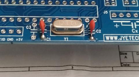 水晶発振器12MHzです。背の低いものから半田付けするのは、ひっくり返して半田付けする際に部品が浮かないようにするためです。先に背の高い部品から付けてしまうと、裏返したとき部品がスルスル~っと抜けて半田付けの難易度が上がりますw