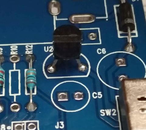 レギュレータそばには電解コンデンサを配置します。ここで困ったことに、普通ならマイナス側が基板上で塗りつぶされているのですが、どっちがどっちだかわかりませんでした。